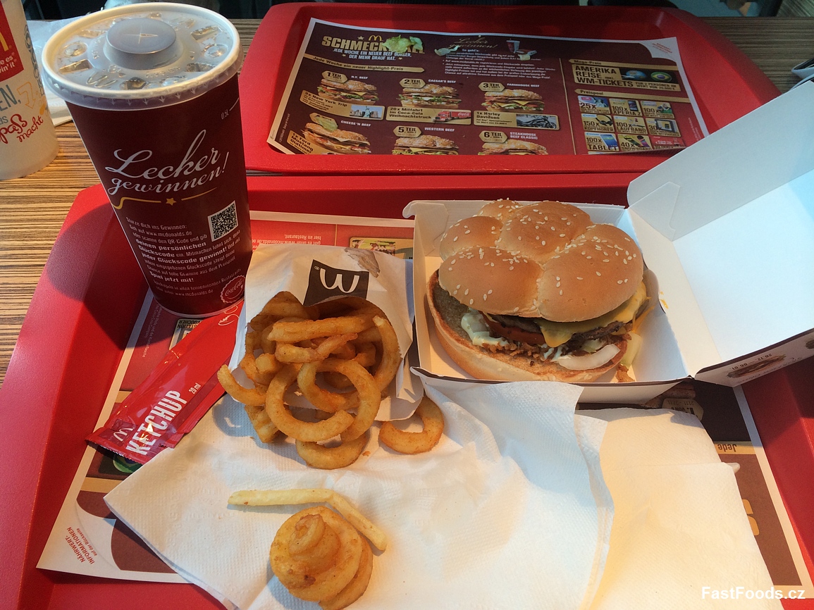 Ve frontě jsem si vybral z místní sezonní nabídky USA Burgerů. Bohužel můj vybraný burger byl v minulém týdnu. Objednal jsem si tedy sýrový Cheese Beef burger se spirály a Coca-Colou. Kečup jsem dostal automaticky a zdarma.